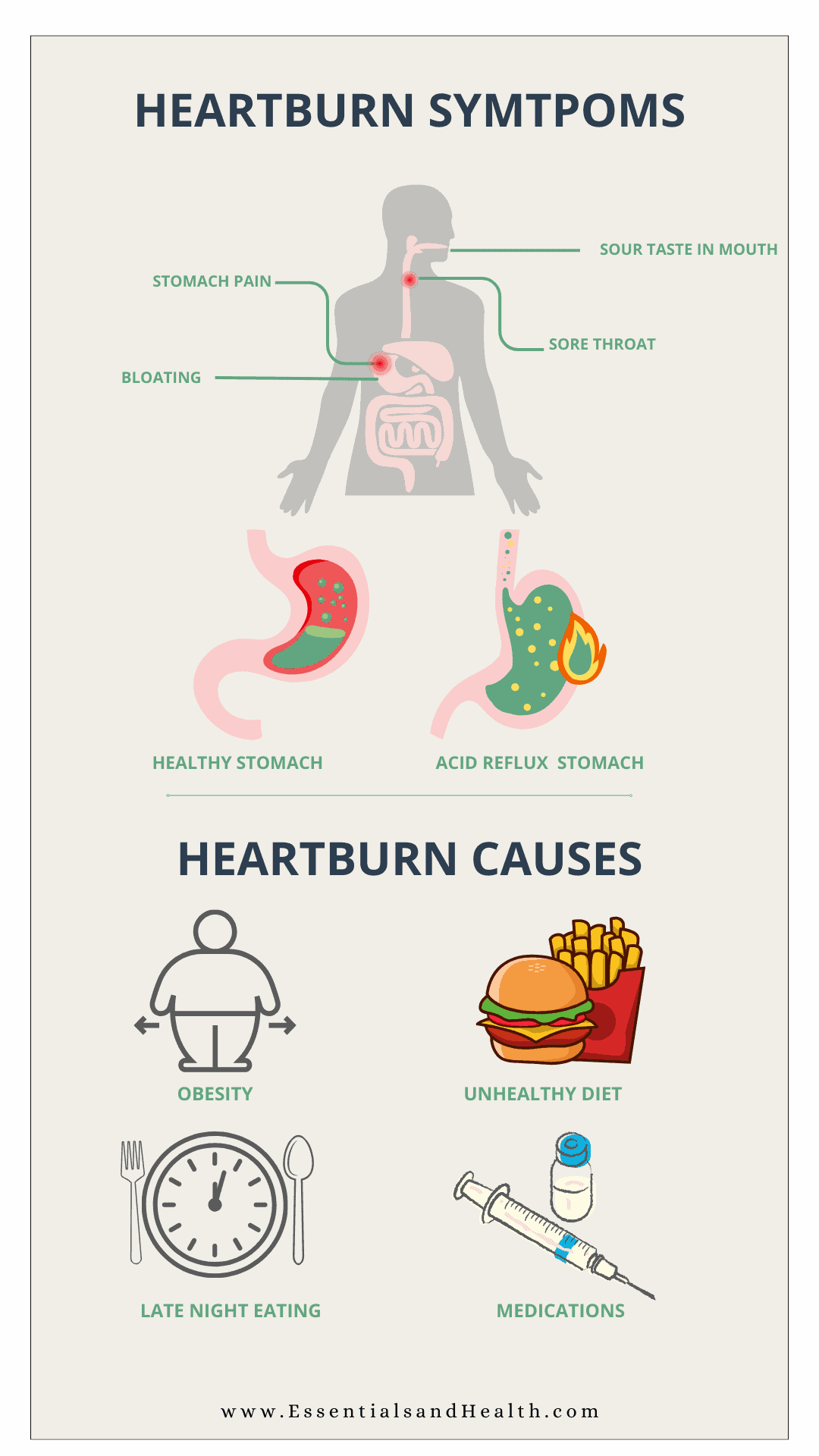 Heartburn occurs when the LES muscles don’t close correctly, which causes stomach acids to travel into the esophagus (acid reflux).